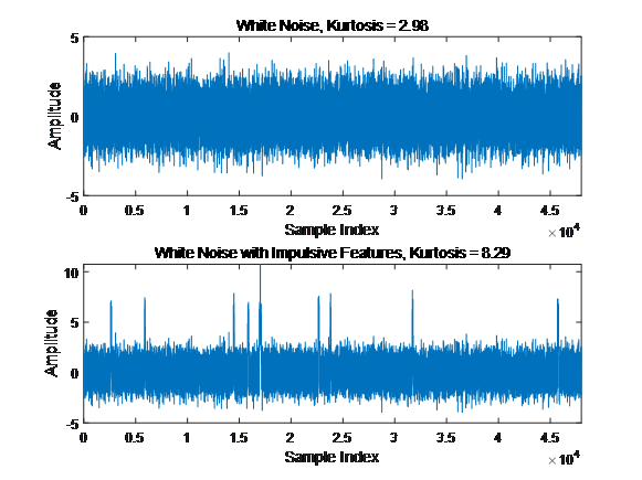 這樣服從正態(tài)分布的數(shù)據(jù)的峰度值為0,因?yàn)檎龖B(tài)分布的四階中心矩與方差平方的比值恰好等于3。簡單來說,峰度可以用來描述信號(hào)的非平穩(wěn)特性,尤其是短時(shí)間內(nèi)突發(fā)的噪聲干擾,如果一段數(shù)據(jù)的峰度值越大,則表明該段數(shù)據(jù)中含有的突發(fā)性噪聲干擾成分較多。下面以一段數(shù)據(jù)分析對比為例,采用信號(hào)仿真方法生成一組隨機(jī)白噪聲信號(hào)和一組添加有突發(fā)性沖擊干擾的白噪聲信號(hào),分別計(jì)算兩組信號(hào)的峰度值可以發(fā)現(xiàn),含有突發(fā)性沖擊特征干擾的白噪聲信號(hào)的峰度值為8.29,明顯大于不含有干擾的白噪聲信號(hào)2.98。